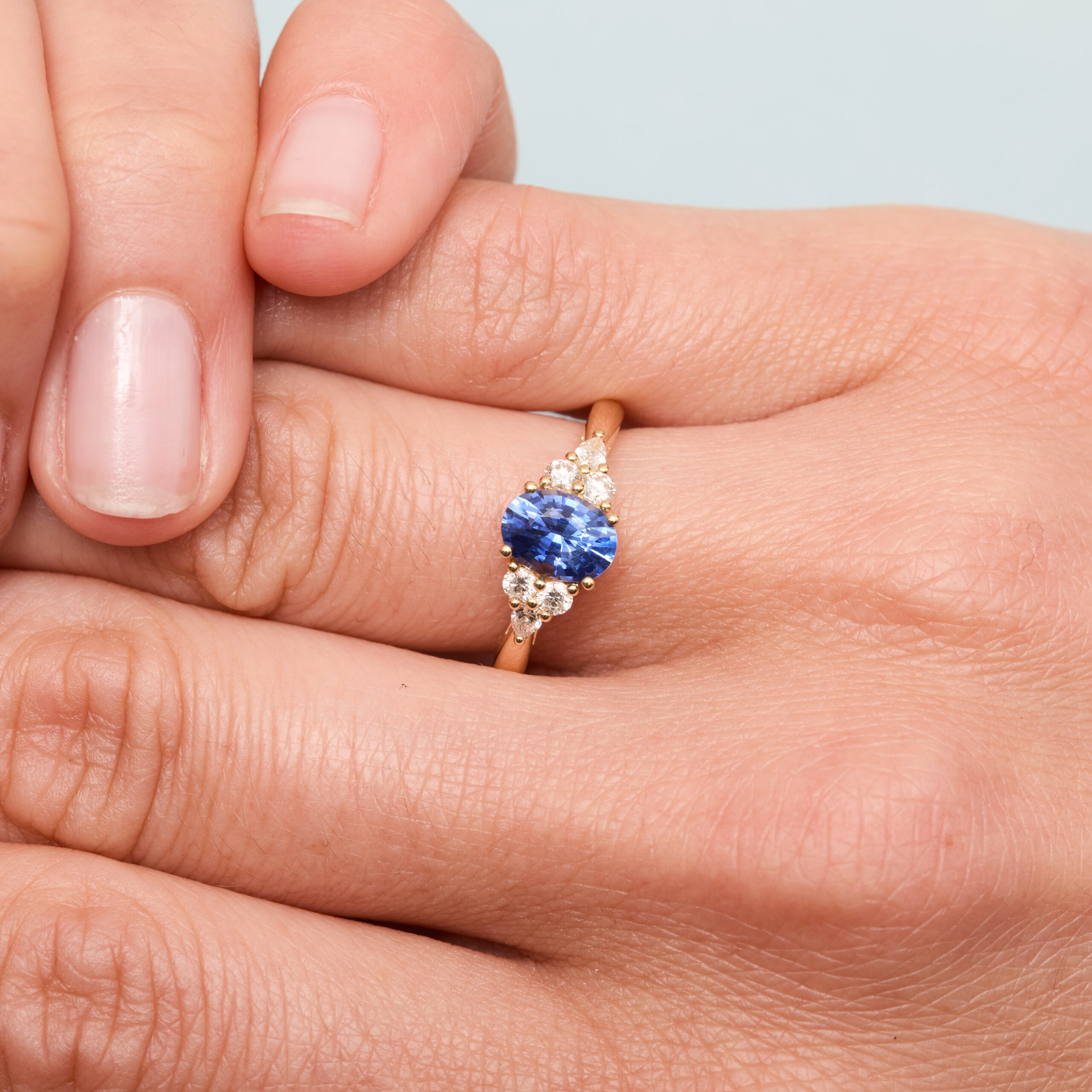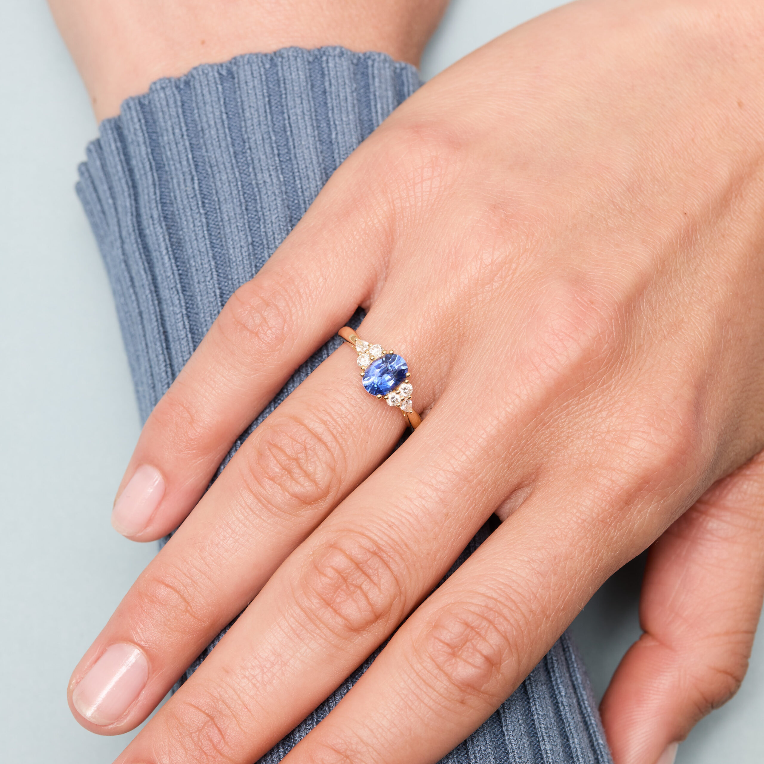 - Bague Althea en or jaune sertie d’un saphir Cornflower de 1.28 carats de forme ovale, accompagnée de 4 brillants de 2.2mm (poids total 0.16 carats) et de 2 diamants FVS poire de 3x2mm (poids total 0.15 carats)