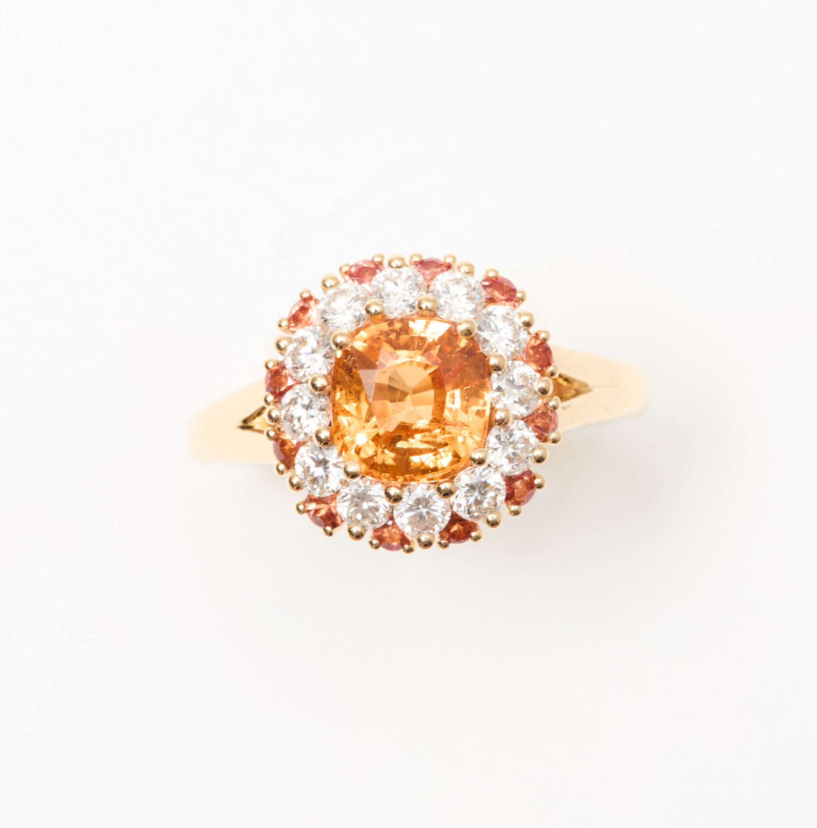 - Bague Colombo en Or jaune sertie d’un Grenat Malaya de 1.94 carats de forme coussin accompagné d’un double entourage de 12 diamants FVS de 2.3mm (poids 0.54 carats) et de 12 Saphirs Orange de 1.8mm (poids total 0.12 carats).