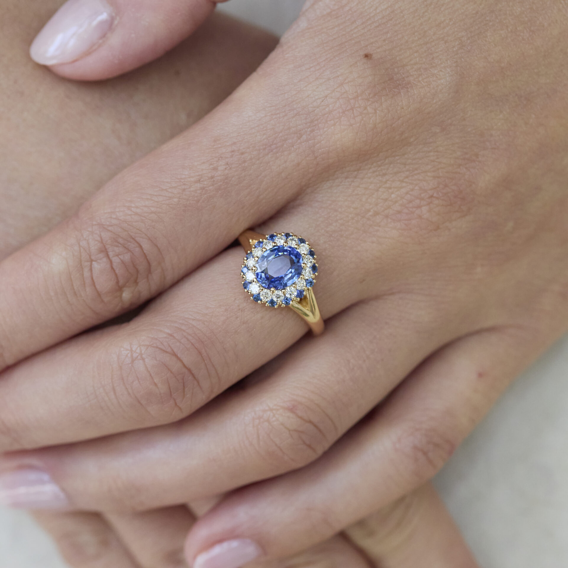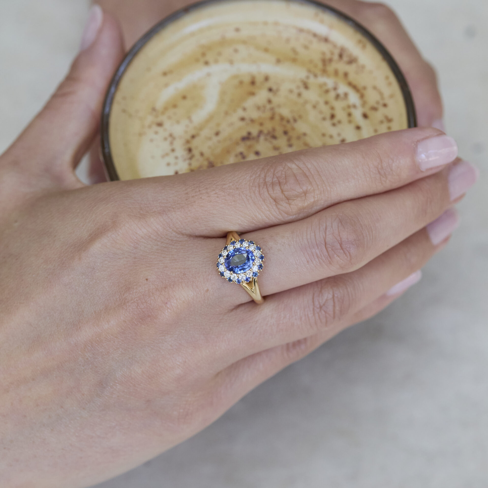 • Bague Colombo en Or jaune sertie d’un Saphir Cornflower de 1.57 carats de forme ovale accompagné d’un double entourage de 14 diamants FVS de 1.8mm (poids 0.35 carats) et de 14 Saphirs bleu de 1.5mm (poids total 0.15 carats).