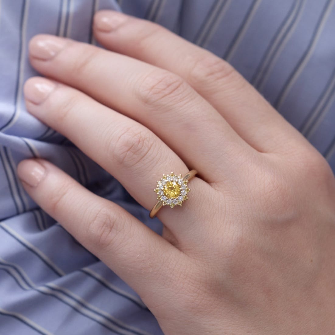 - Bague colombo en or jaune sertie d’un saphir jaune de 0.58 carats de forme ronde, accompagnée de 12 diamants FVS de 2mm (0.36 carats) et d’un double entourage de 12 saphirs jaunes de 1.5mm. (0.12 carats)