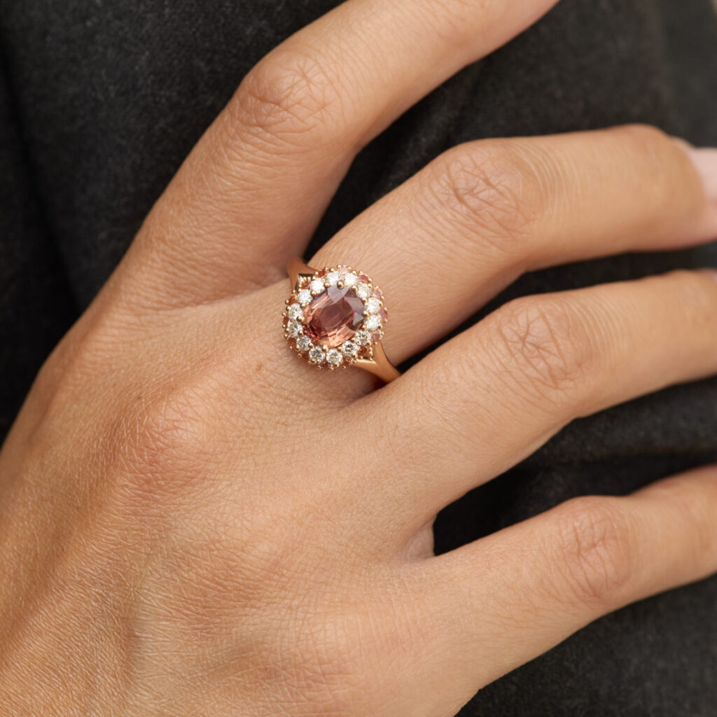 Cette Colombo Matara est chaleureuse et moderne. L’or rose, symbole de douceur, s’accorde aux nuances rose orangé du Padparadscha. Le double entourage de diamants et de saphirs met en valeur la pierre et équilibre la bague.