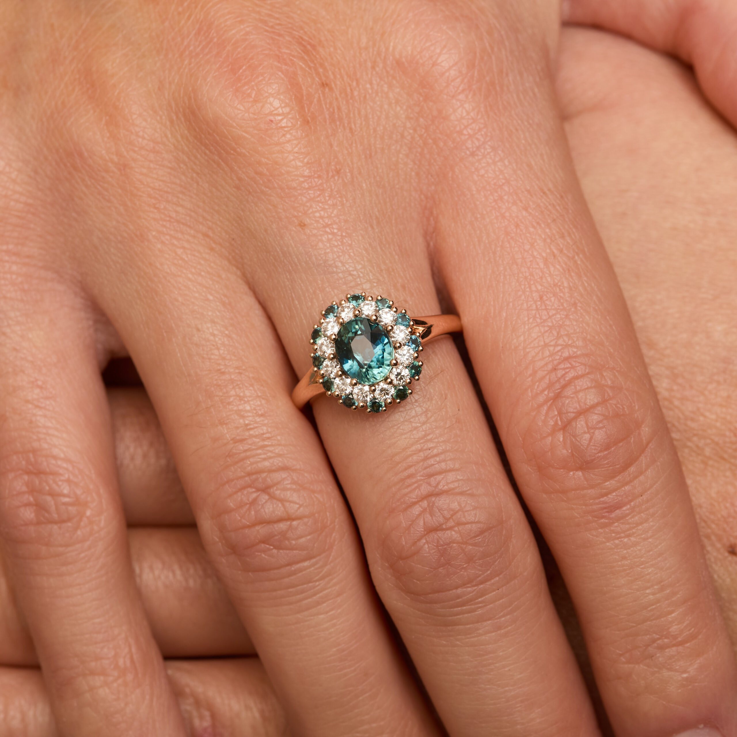 Une bague moderne. Le Teal dévoile ses nuances bleu-vert sur l’or rose. Le double entourage apporte une lumière régulière qui met la pierre en valeur.