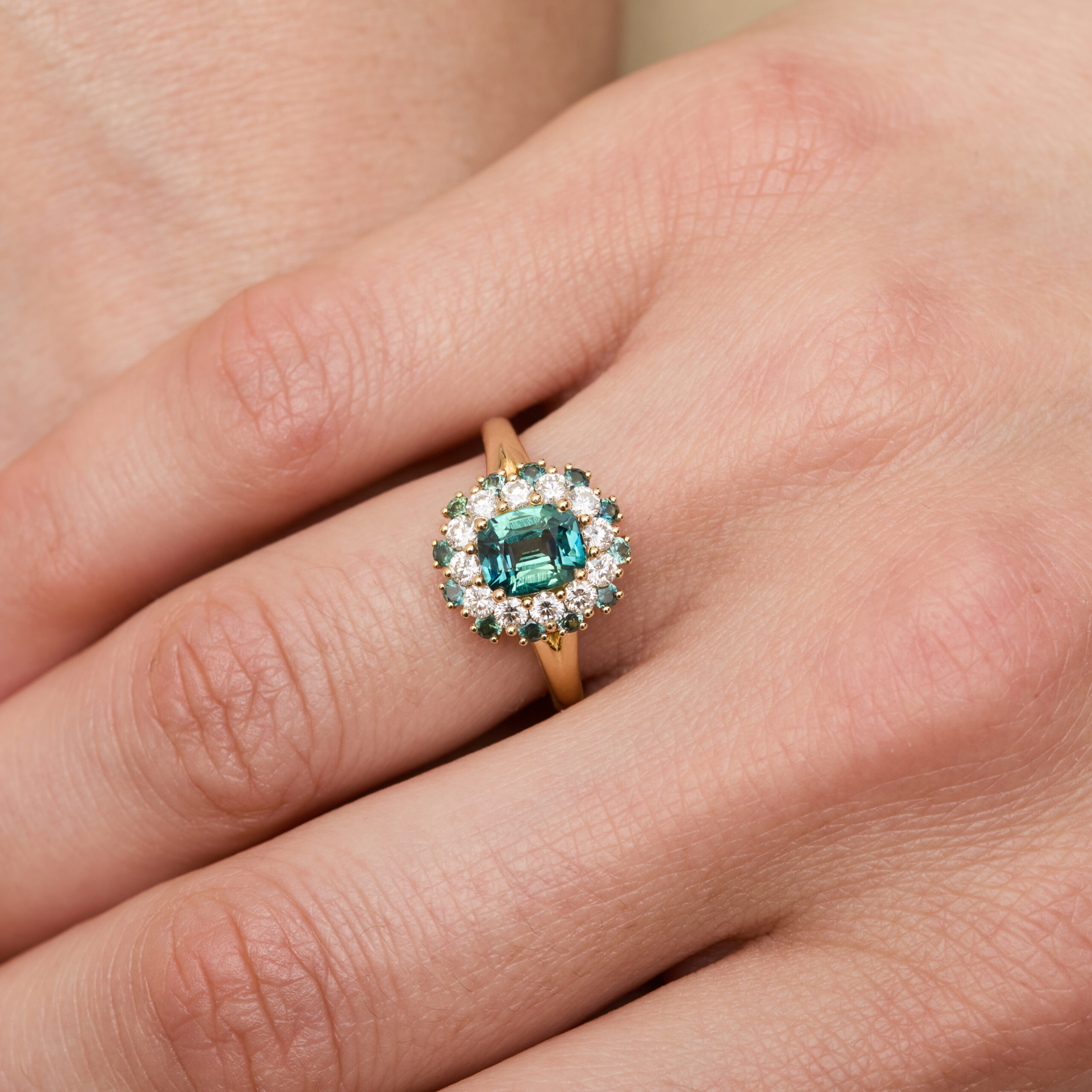 L’or jaune réchauffe les nuances du saphir teal. La forme coussin accentue l’élégance naturelle de la pierre, et les diamants ajoutent une touche finale de lumière.