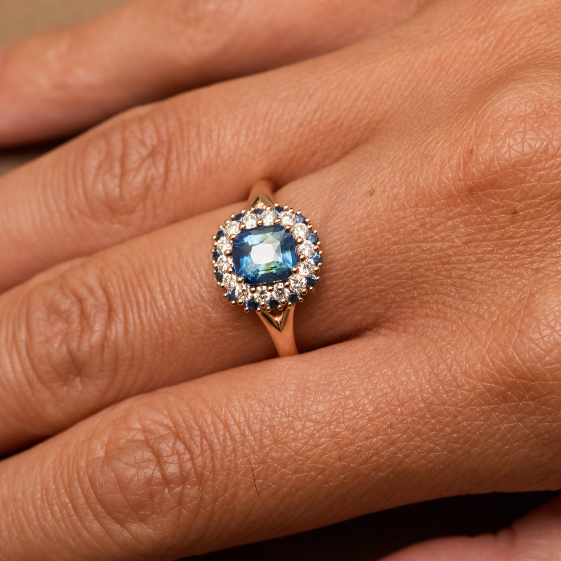 • Bague Colombo en Or rose sertie d’un Saphir Teal de 1.60 carats de forme coussin accompagné d’un double entourage de 14 diamants FVS de1.8mm (poids 0.36 carats) et de 14 Saphirs Teal de 1.5mm (poids total 0.15 carats).