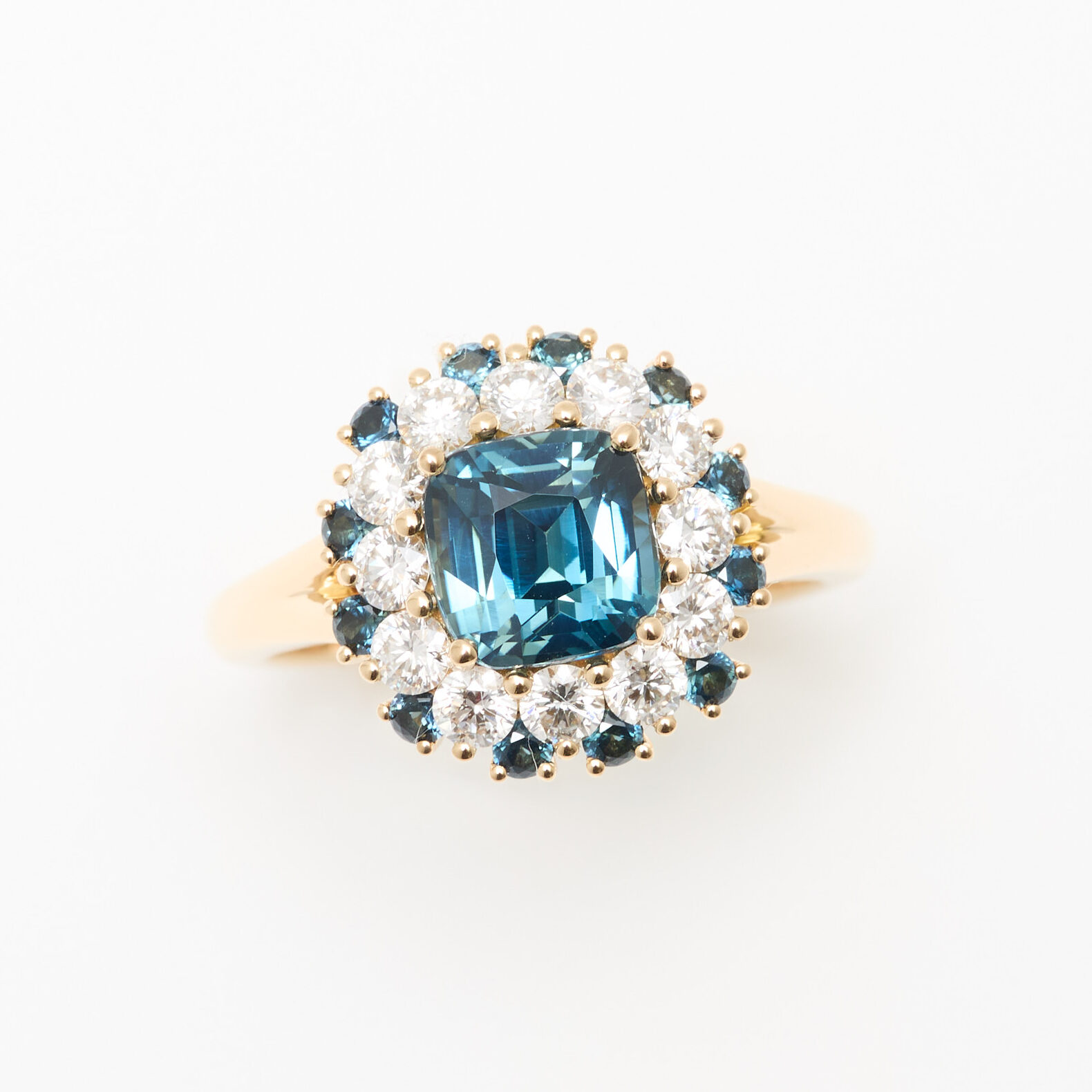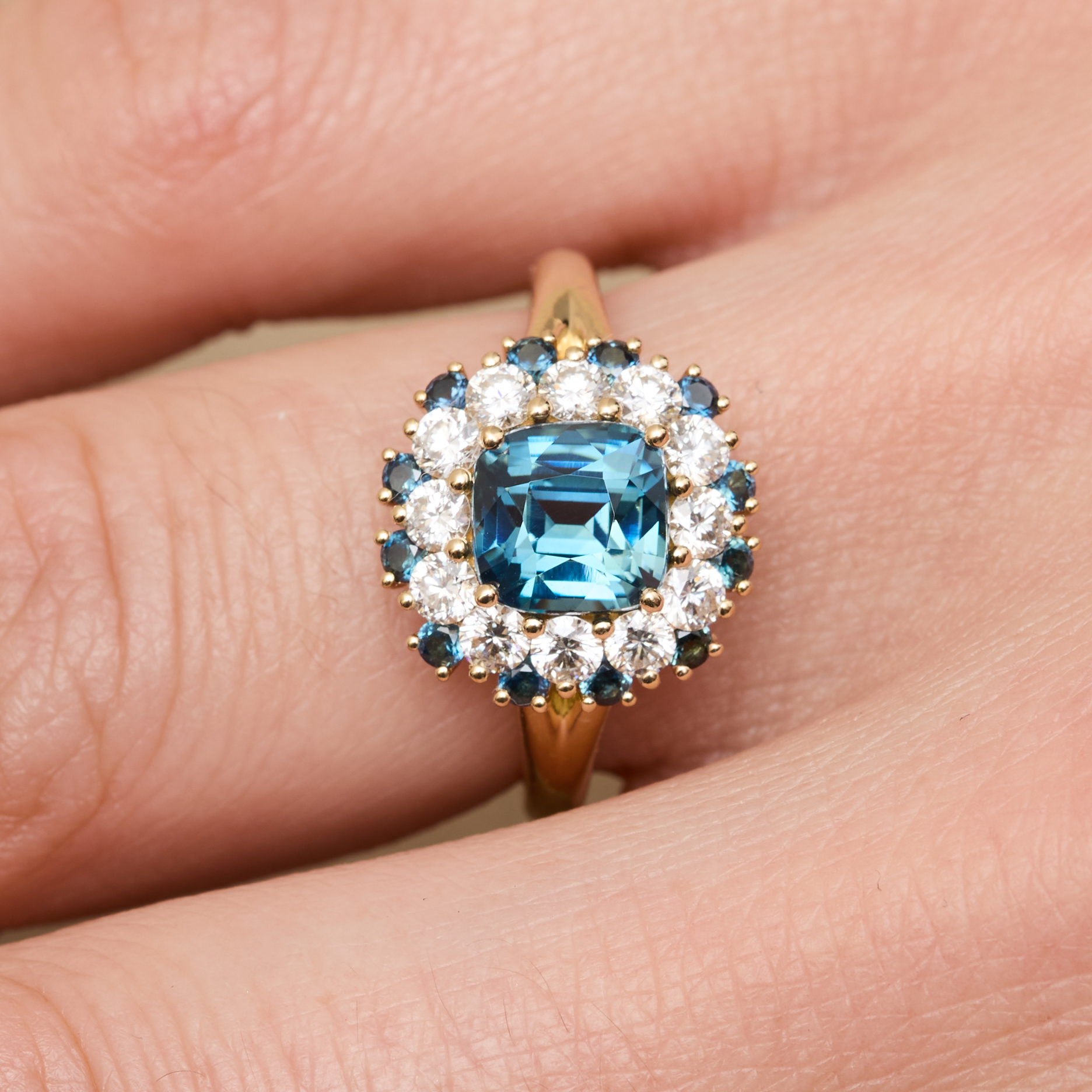 - Bague Colombo en Or jaune sertie d’un Saphir Teal Indigo de 2.11 carats de forme coussin carré accompagné d’un double entourage de 12 diamants FVS de 2.4 mm (poids 0.60 carats) et de 18 Saphirs de 1.8 mm (poids total 0.20 carats).