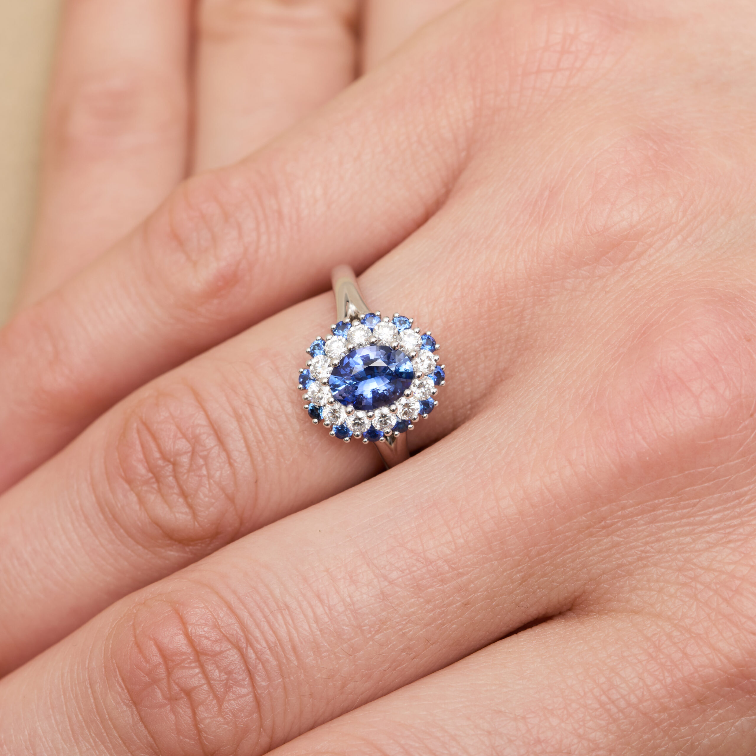 Un éclat audacieux et lumineux. L’or blanc s’accorde parfaitement à la profondeur du Saphir Vivid blue. Un double entourage de diamants et de saphirs bleus vient rehausser l’ensemble, offrant un jeu de lumière saisissant et un équilibre parfait entre tradition et modernité.