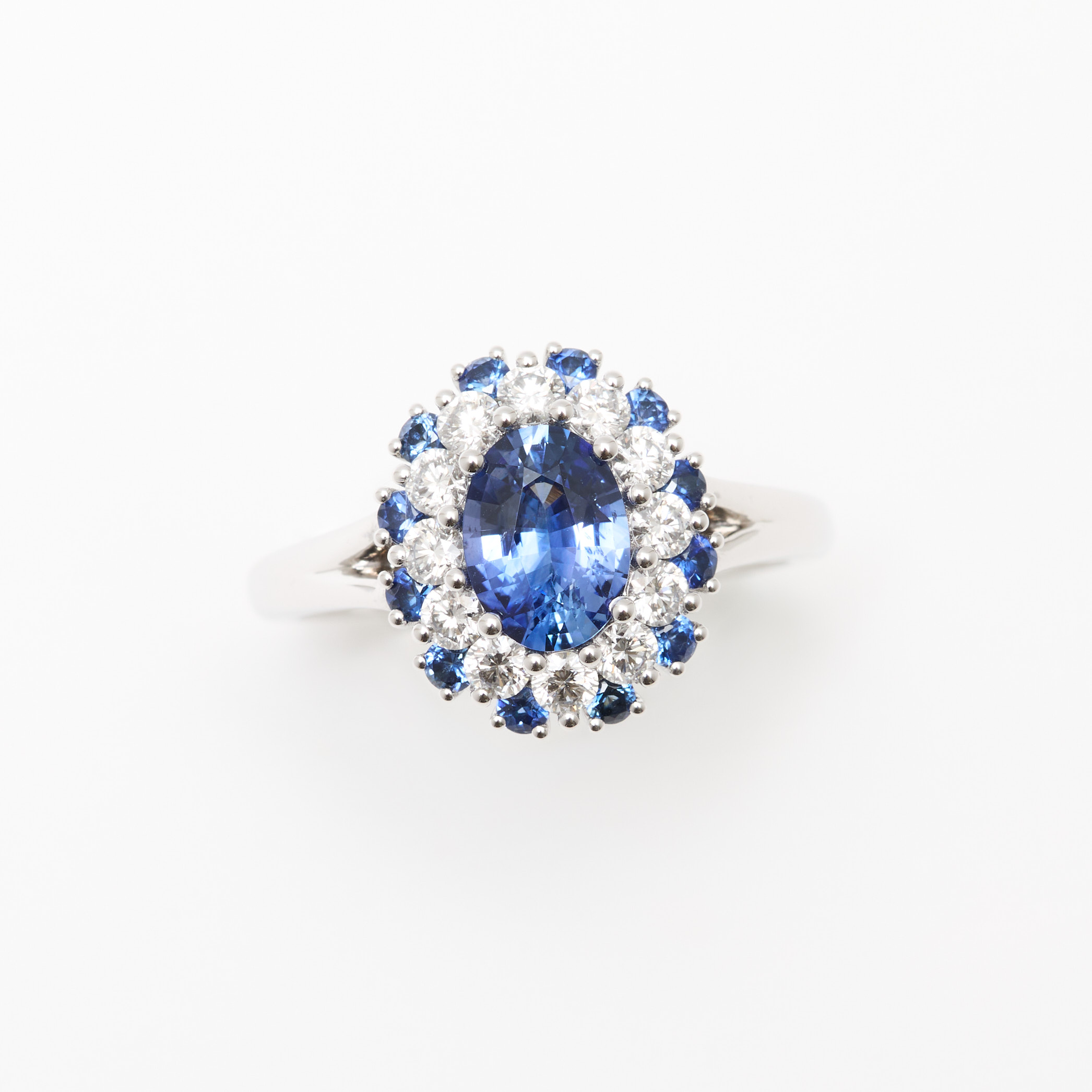 - Bague Colombo en Or blanc sertie d’un Saphir Vivid Blue de 1.11 carats de forme ovale accompagné d’un double entourage de 12 diamants FVS de 2.2mm (poids 0.48 carats) et de 12 Saphirs bleus de 1.8mm (poids total 0.18 carats).