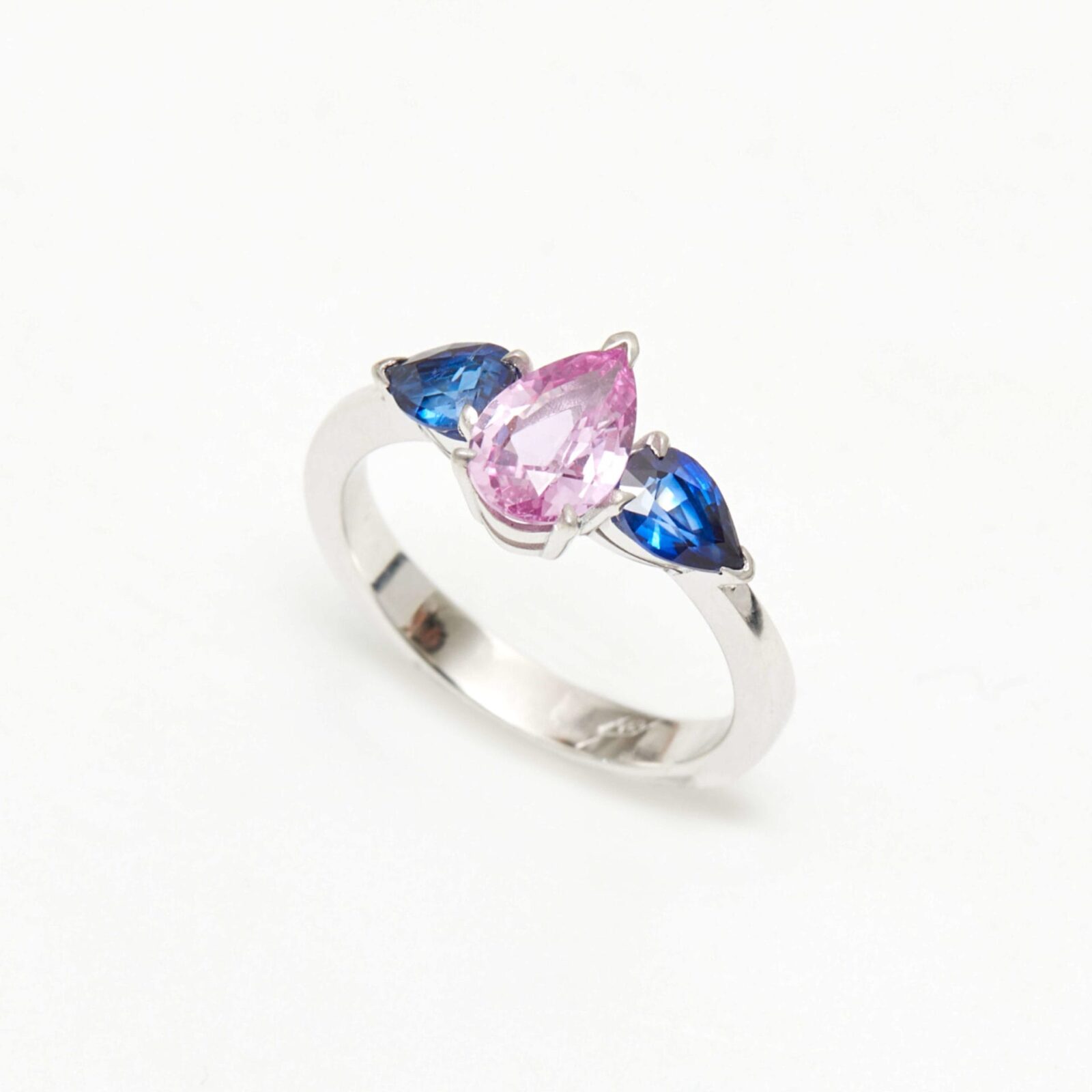 - Bague Elahera en or blanc 18 carats, sertie d’un Saphir rose 1.12 carat et de deux saphirs Royal Blue (total 0.75 carats)