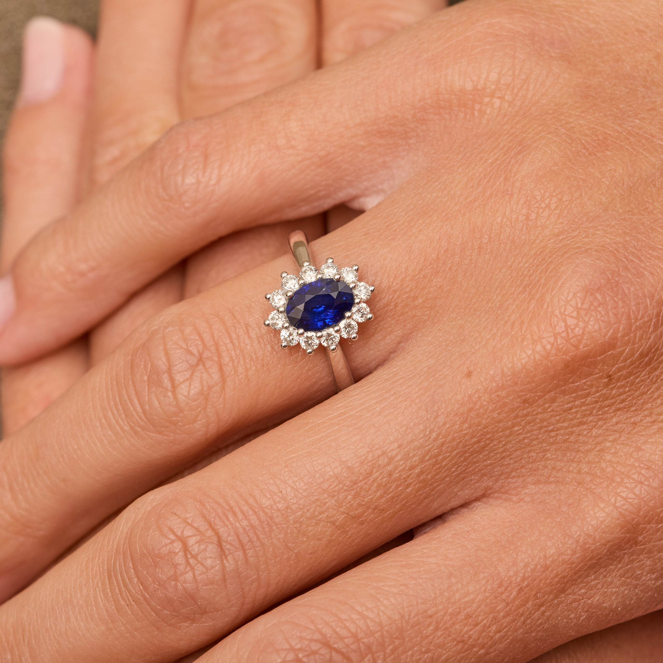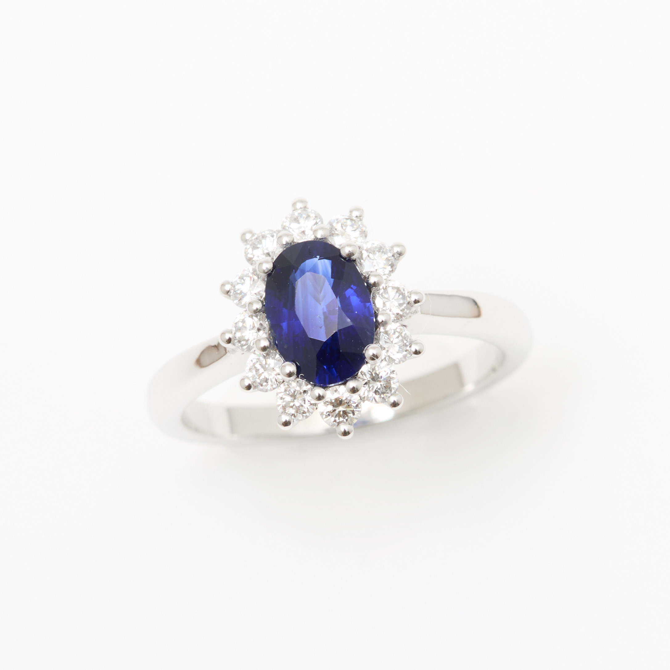 • Bague Ella en Or blanc sertie d’un Saphir Peacock de 1.01 carats de forme ovale entouré de 12 diamants FVS de 2.1 mm (poids total 0.40 carats)