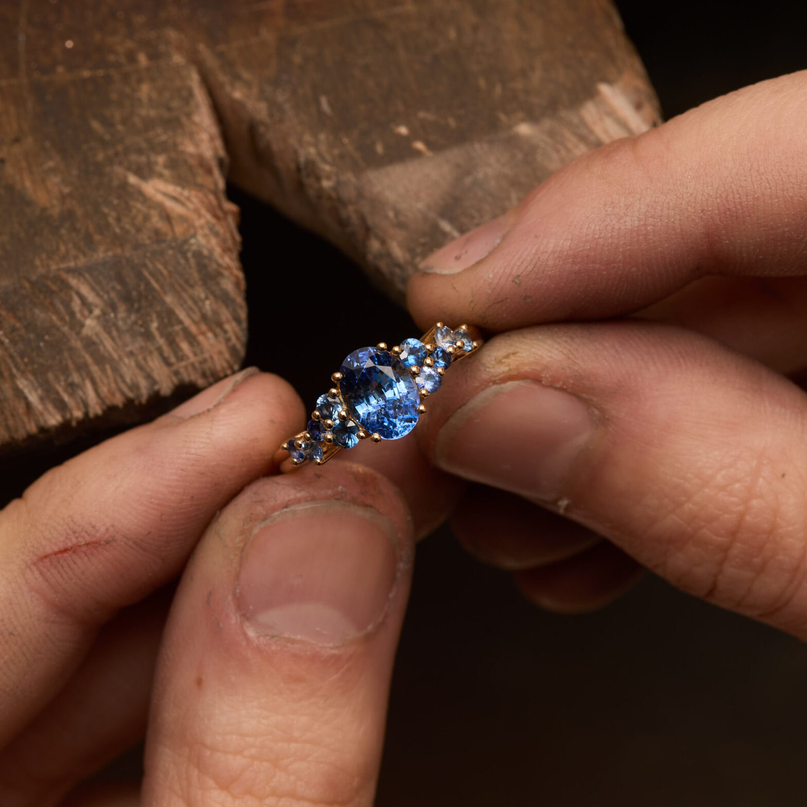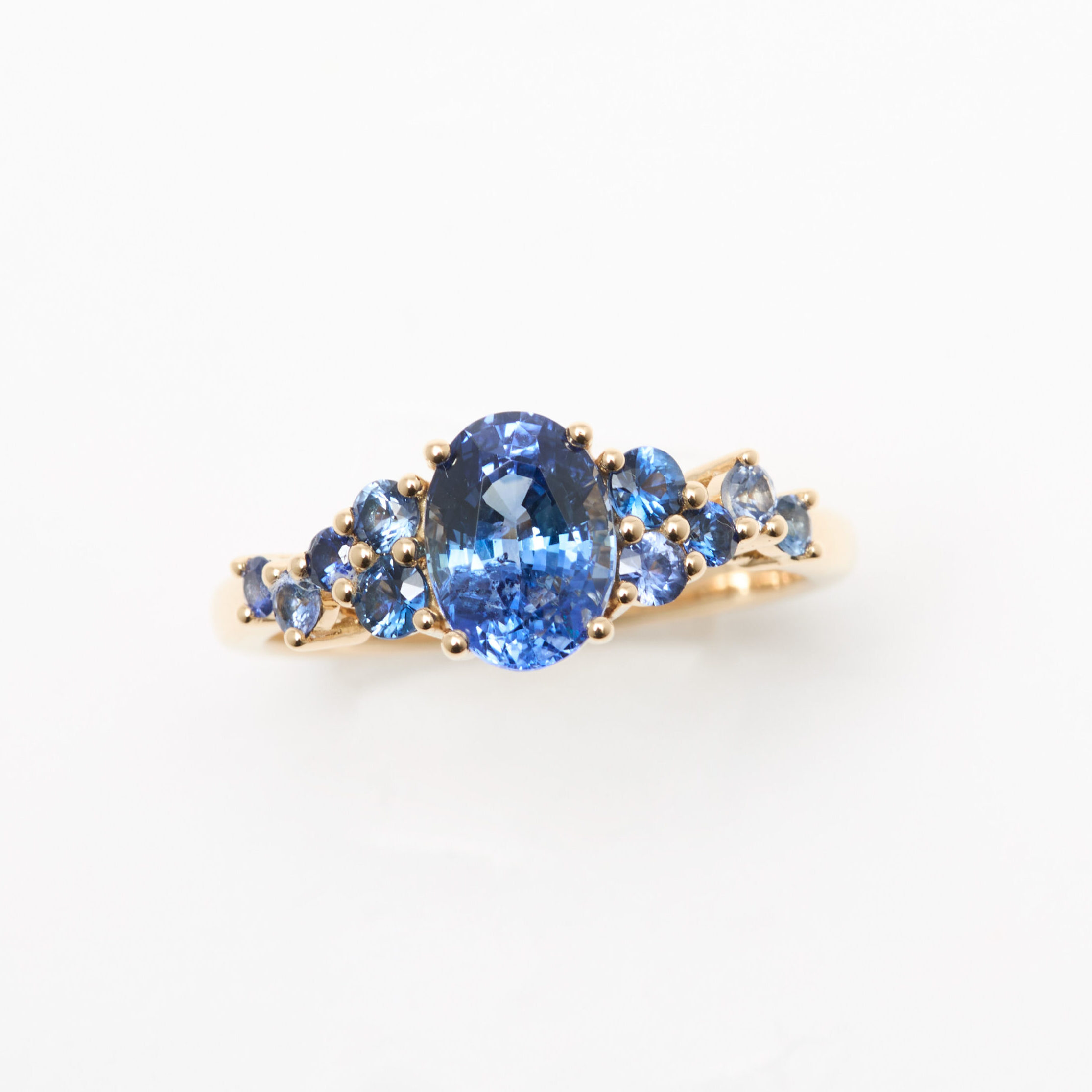 • Bague Horana en Or jaune sertie d’une Saphir Cornflower de 1,58 carats de forme ovale accompagnée d’une constellation de 10 saphirs bleus (0,36 carats au total).