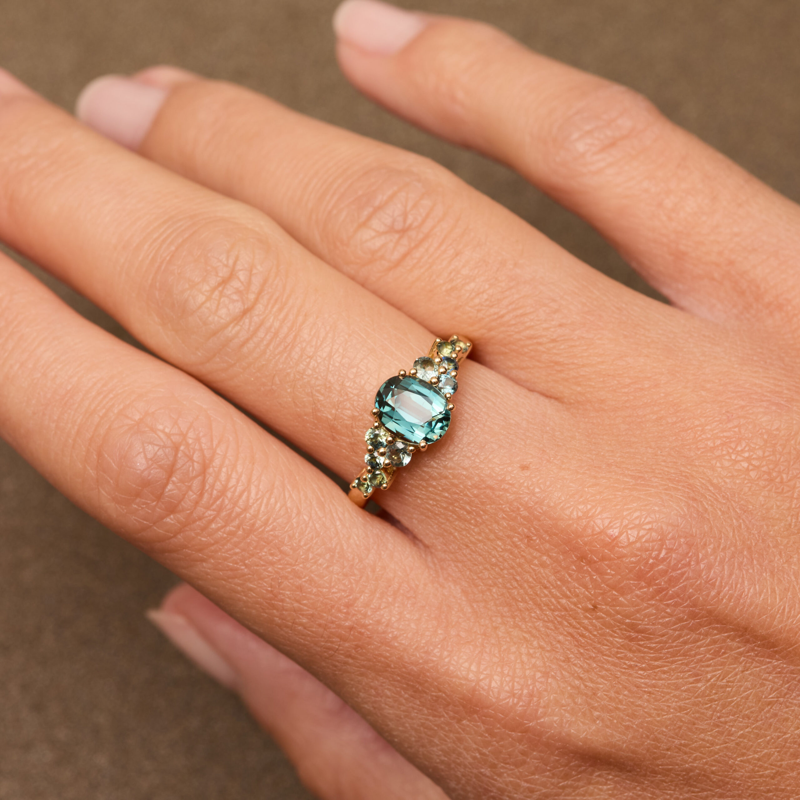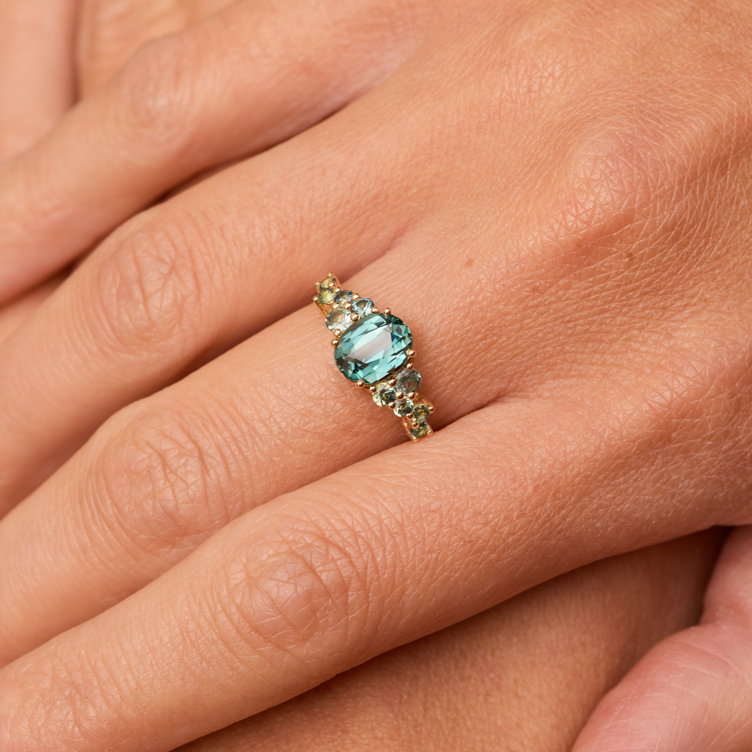 - Bague Horana en Or jaune sertie d’une Saphir Teal de 1.70 carats de forme ovale accompagnée d’une constellation de 10 Saphirs Teal (0,30 carats au total).