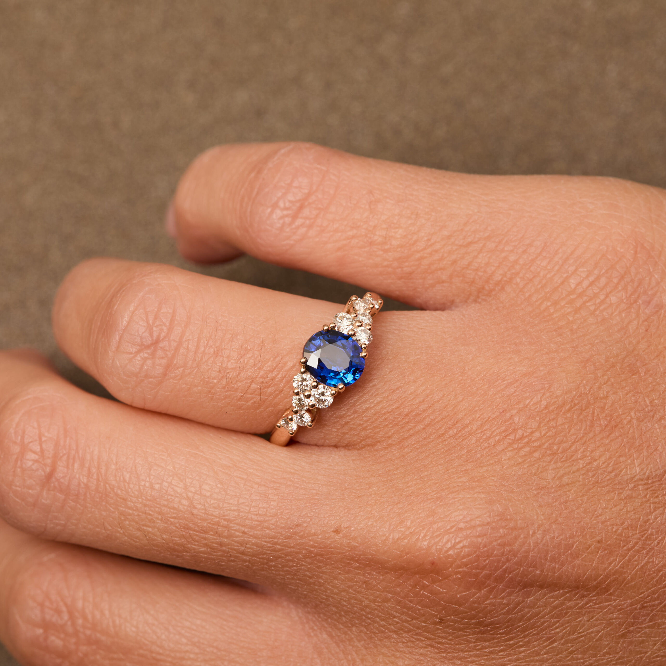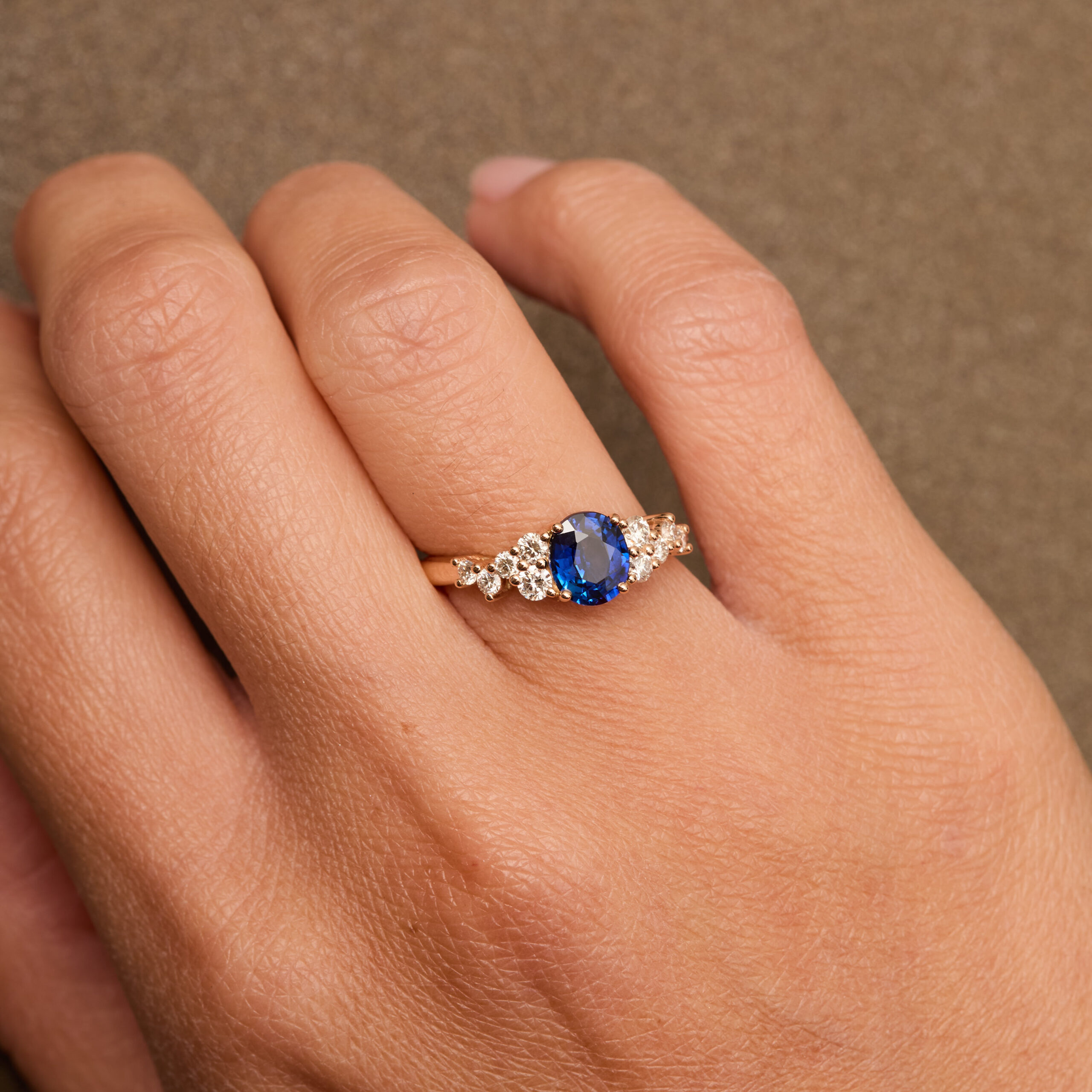 - Bague Horana en Or rose sertie d’une Saphir Peacock de 1.15 carats de forme ovale accompagnée d’une constellation de 10 diamants FVS (0,37 carats au total).