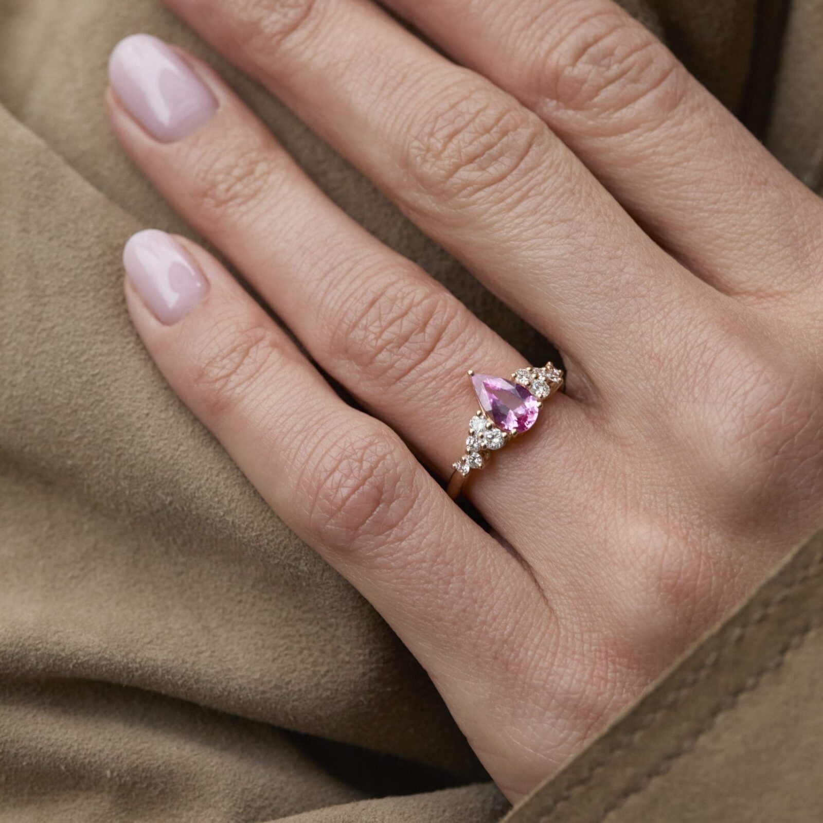 - Bague Horana en or rose sertie d’un Saphir Rose de 1.21 carats de forme poire, accompagnée d’une constellation de 10 diamants FVS (poids total 0,37 carats)