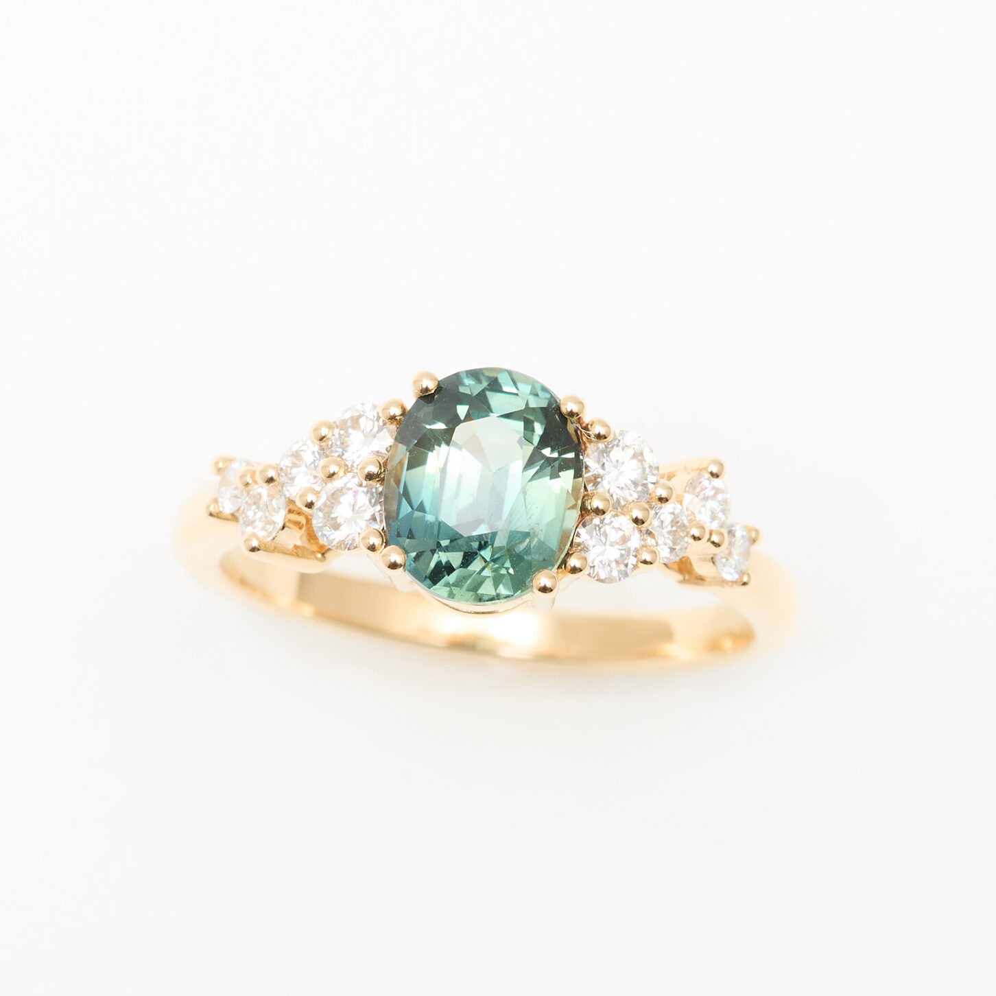 • Bague Horana en Or jaune sertie d’une Saphir Teal de 1.62 carats de forme ovale accompagnée d’une constellation de 10 diamants FVS (0,37 carats au total).
