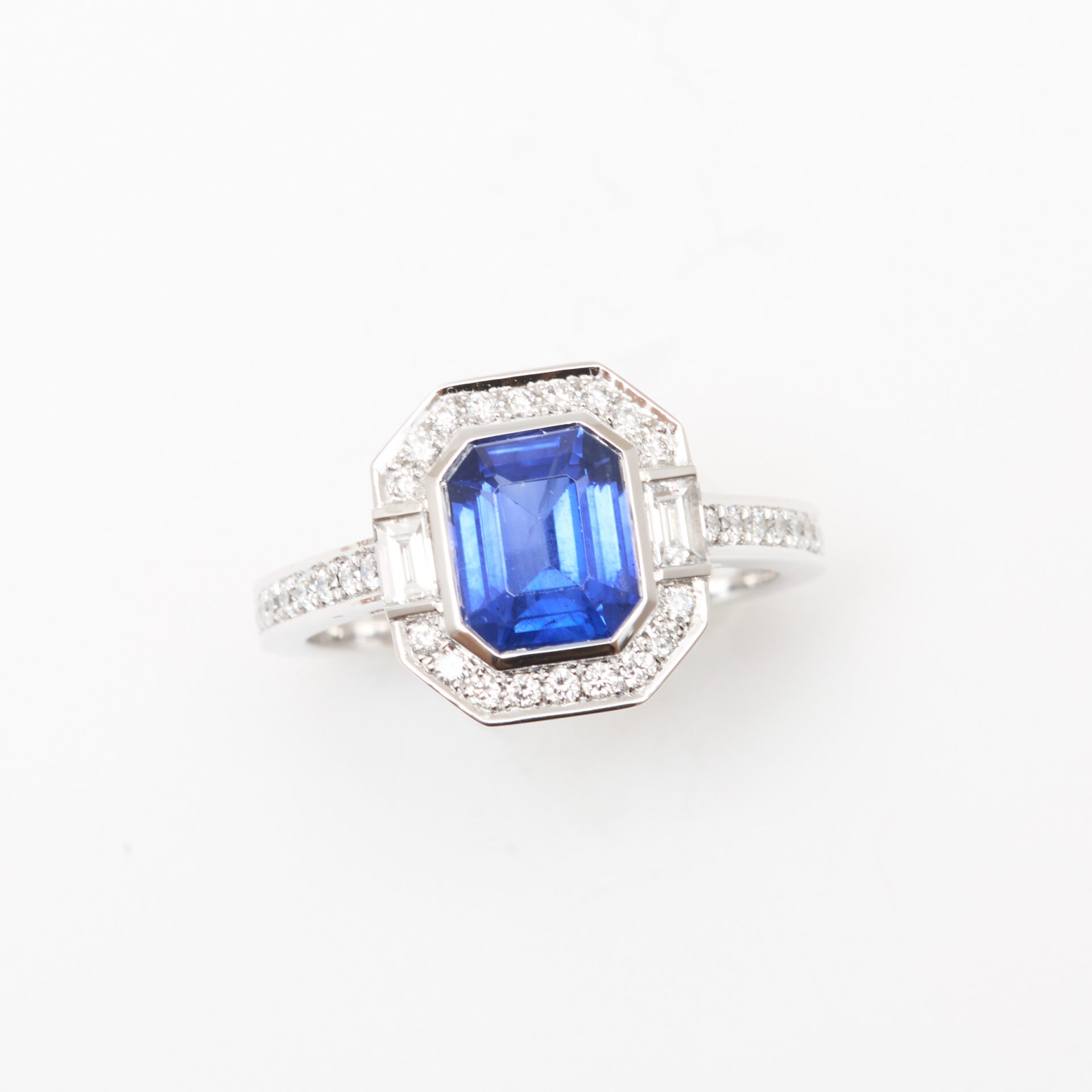 - Bague Jaffna Art Déco en or blanc sertie d’un Saphir Peacock de 1.89 carats de taille émeraude accompagné de 36 diamants FVS de 1.2mm et deux diamants baguettes 3 x 2mm (poids total 0.39 carats)