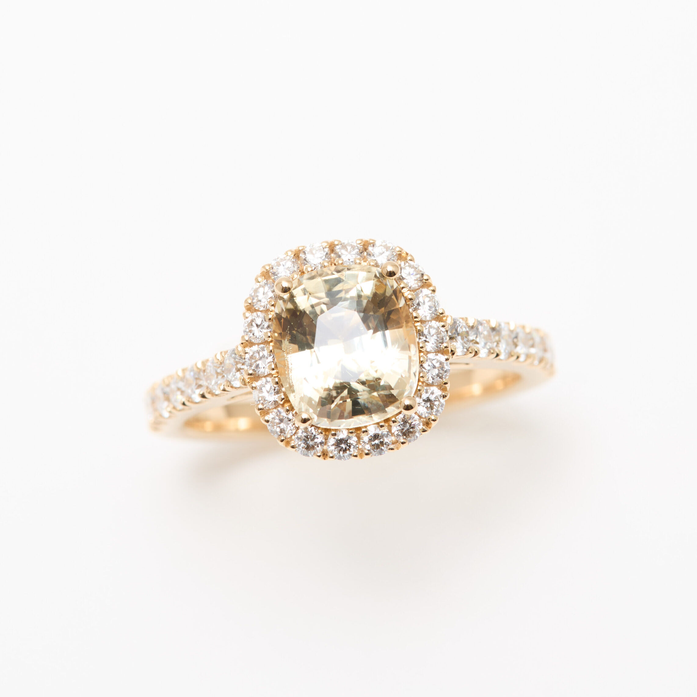 • Bague Jaffna en Or jaune sertie d’un Saphir jaune de 2.08 carats de forme coussin avec un entourage de 18 diamants FVS de 1.5 mm et 14 diamants de 1.8mm sur l’anneau. (poids total 0.55 carats)