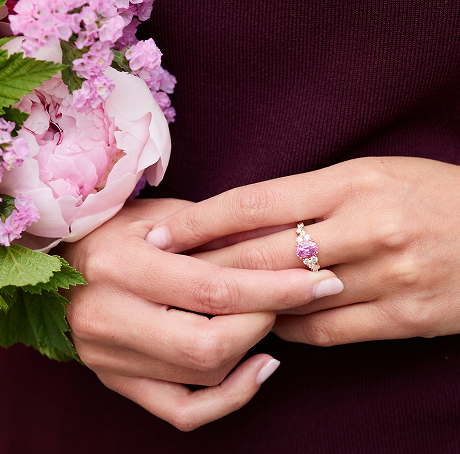 Cette bague Jaffna séduit par sa finesse. L’or rose, symbole de douceur, met en valeur le saphir Padparadscha et ses reflets lumineux. Un entourage de diamants vient sublimer la pierre centrale et accentuer son éclat.