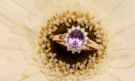 - Bague Jaffna en Or rose sertie d’un Saphir Padparadscha de 1.57 carats de forme ovale avec un entourage de 16 diamants FVS de 1.6mm et 14 diamants de 1.8mm sur l’anneau. (poids total 0.59 carats)