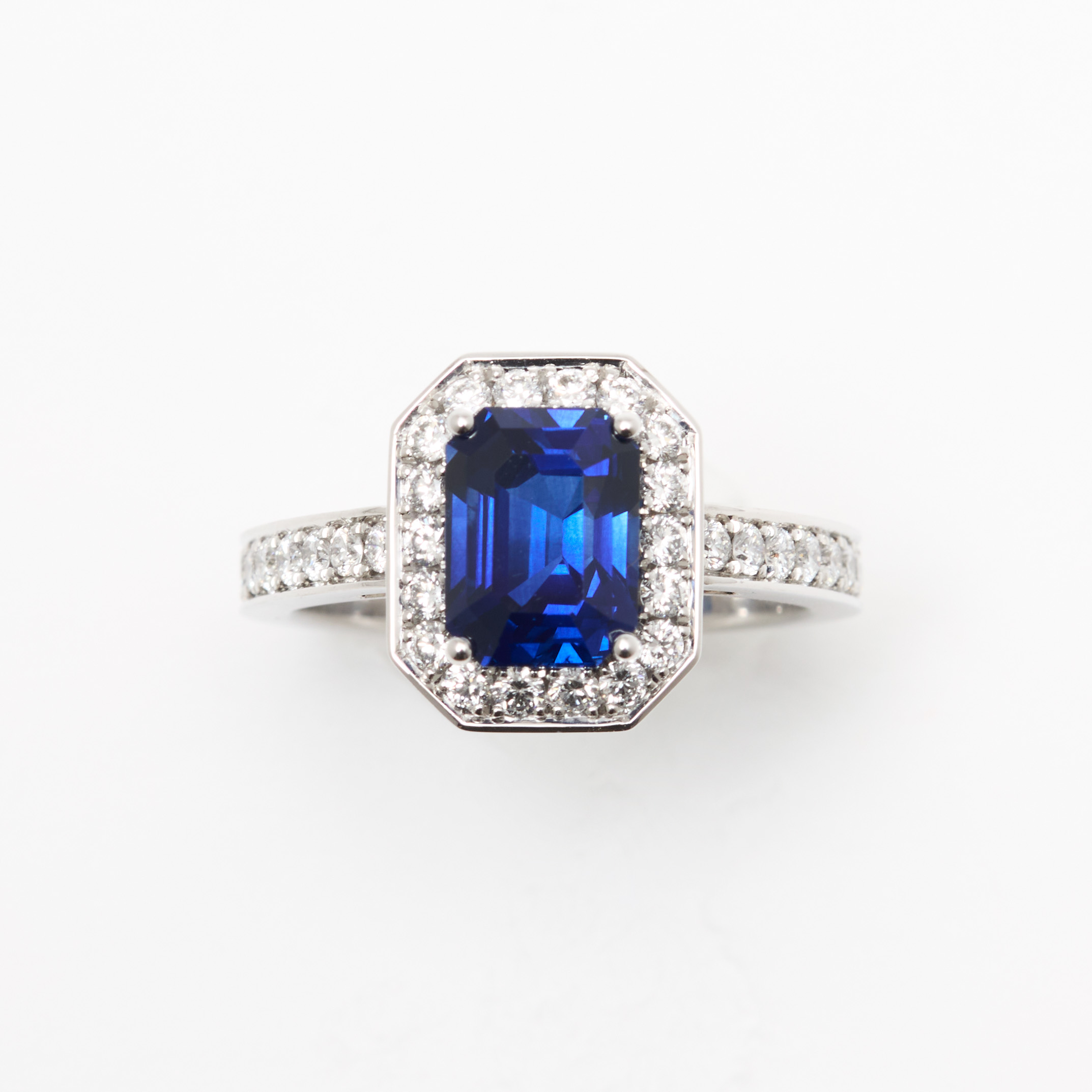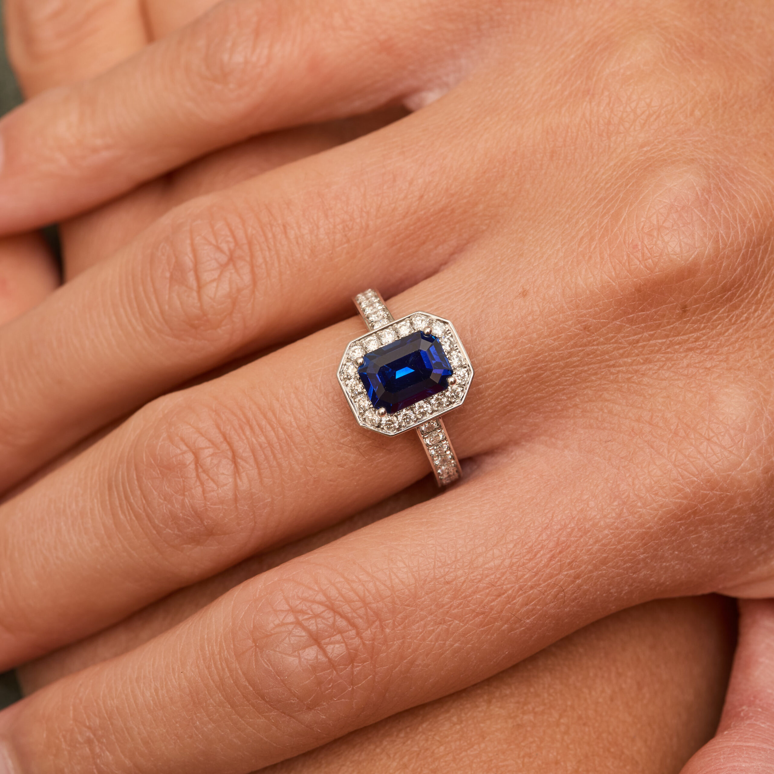 - Bague Jaffna en Or blanc sertie d’un Saphir Peacock de 2.76 carats de taille émeraude avec un entourage de 36 diamants FVS de 1.6 mm (poids total 0.54 carats)