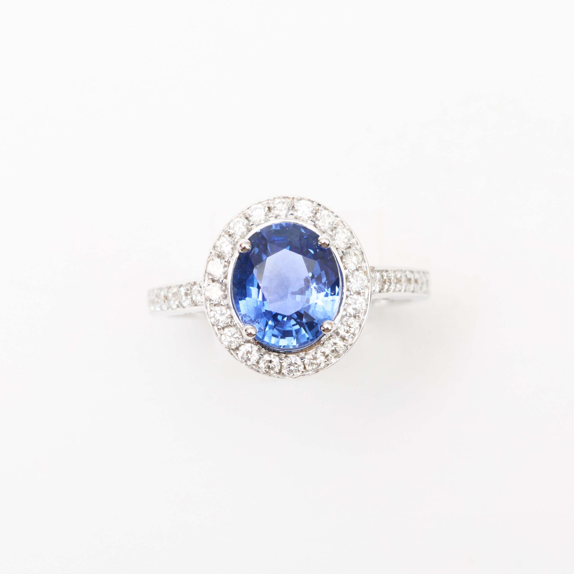 - Bague Jaffna en or blanc 18 carats (4.34g) sertie d’un Saphir vivid blue 2.02 carats entouré de diamants.