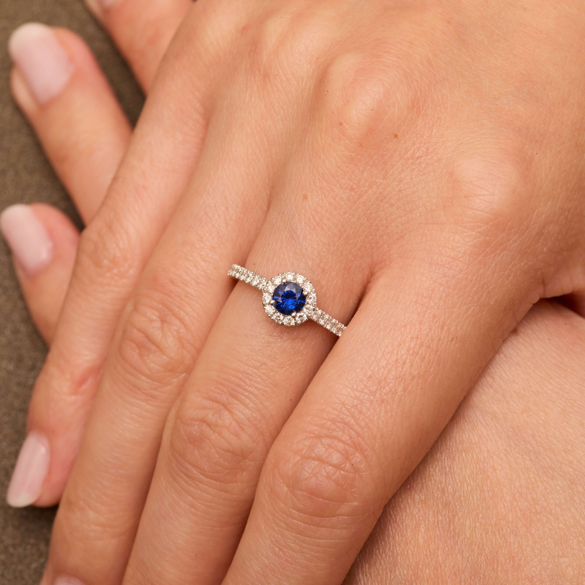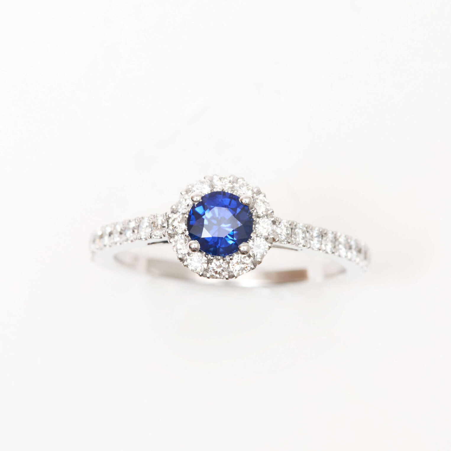 - Bague Lily Jaffna en Or blanc sertie d’un Saphir Peacock de 0.52 carats de forme ronde avec un entourage de 30 diamants FVS de 1.4mm (poids total 0.36 carats)