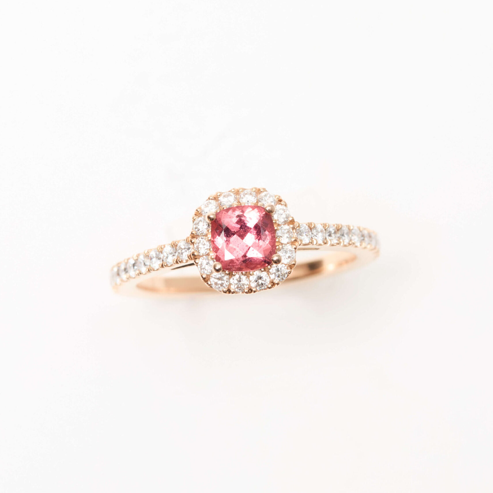 - Bague Lily Jaffna en Or rose sertie d’un Spinelle Mahenge de 0.47 carats de forme coussin avec un entourage de 32 diamants FVS de 1.4mm (poids total 0.38 carats)