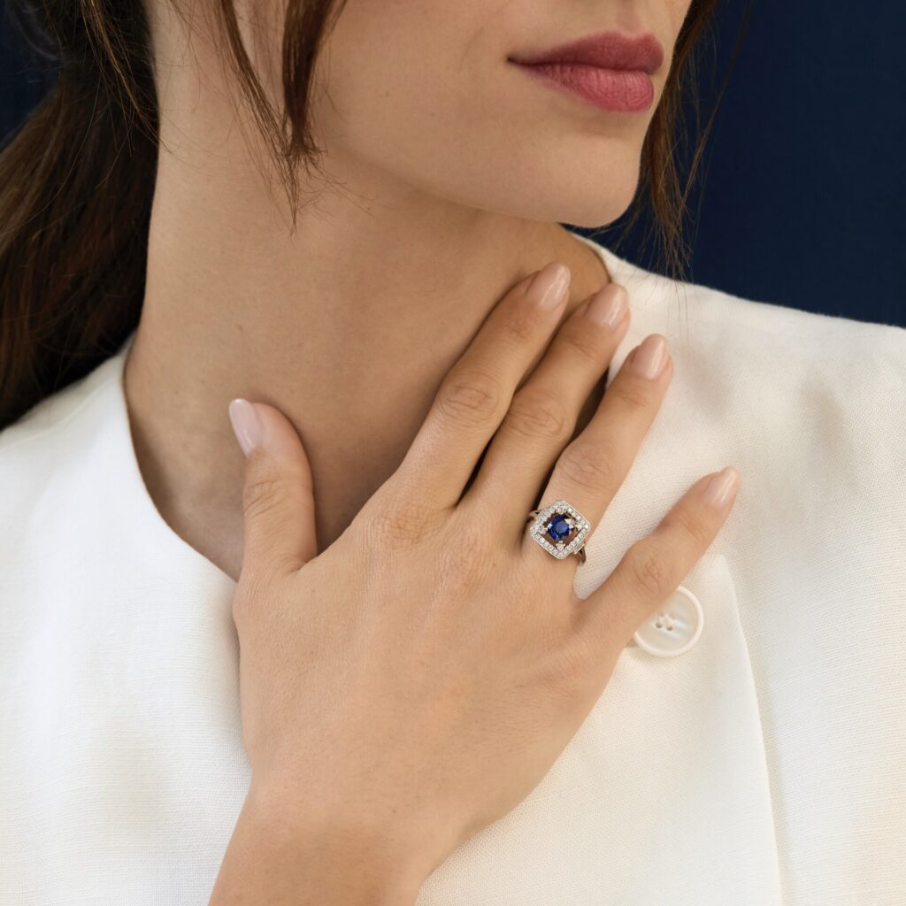 La bague “Louise” capture l’essence chic et sophistiquée de la Place Vendôme. Façonnée en or blanc, elle met en scène un diamant coussin allongé, suspendu comme par magie grâce à un serti griffes pavé. L’entourage de diamants et les lignes architecturales rappellent le style Art Déco, tandis que la fourche élégante du corps de la bague ajoute une touche de modernité. Une création pour celles qui apprécient l’alliance du classique et du contemporain.
