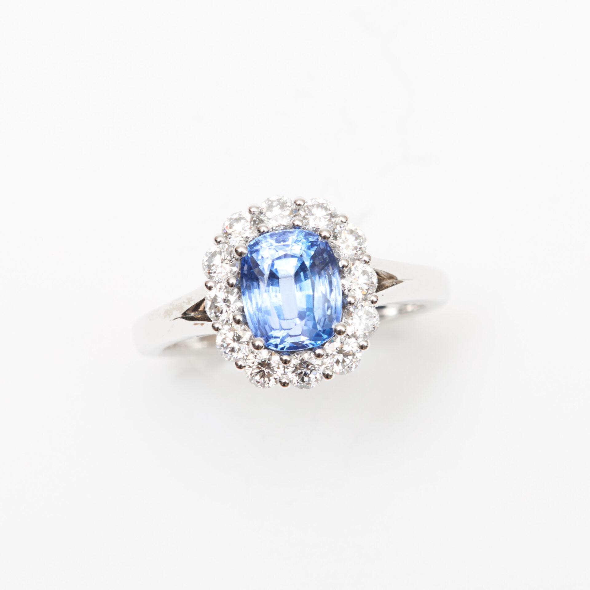 • Bague Ella en or blanc sertie d’un Saphir Cornflower de 2.22 carats de forme coussin accompagné de 12 diamants FVS de 2.4mm (poids total 0.60 carats)