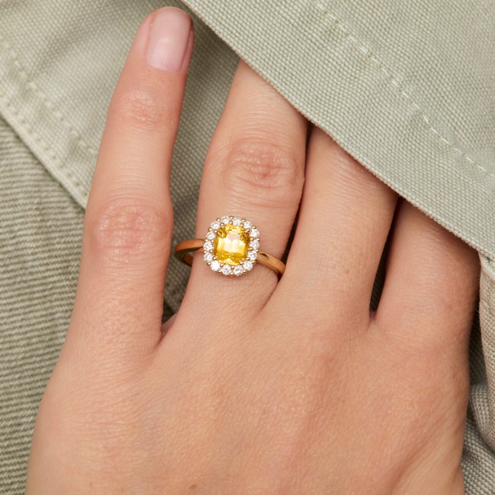 ● Bague Matara en or jaune sertie d’un Saphir Jaune de 1.65 carats de forme coussin entouré de 14 diamants FVS de 1.8mm (poids total 0.30 carats)