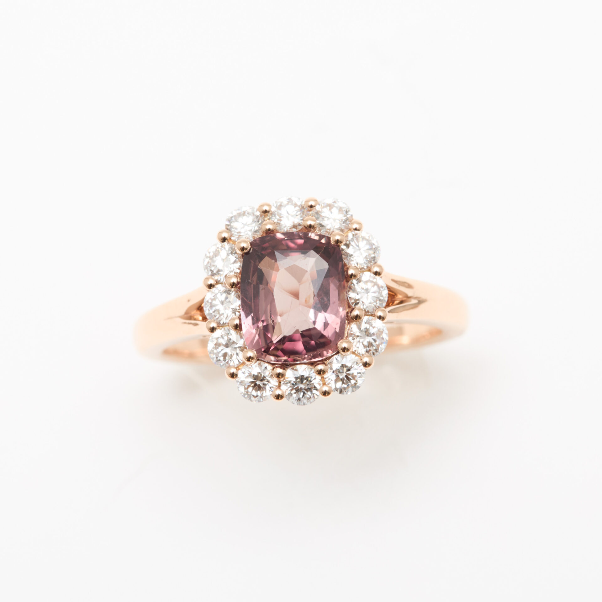 - Bague Matara en or rose sertie d’un Saphir Padparadscha de 1.65 carats de forme coussin accompagné de 12 diamants FVS de 2.4mm (poids total 0.60 carats)
