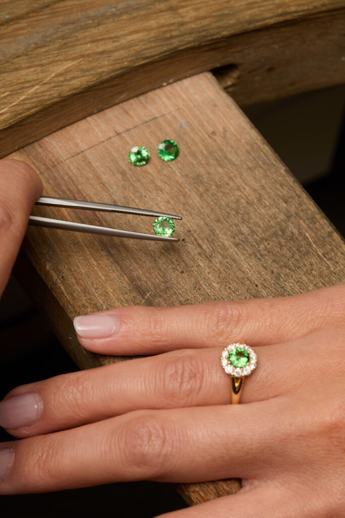 - Bague Matara en Or jaune sertie d’un Tsavorite Mint de 0.73 carats de forme ronde avec un entourage de 10 diamants de 2.2mm. (poids total 0.40carats)