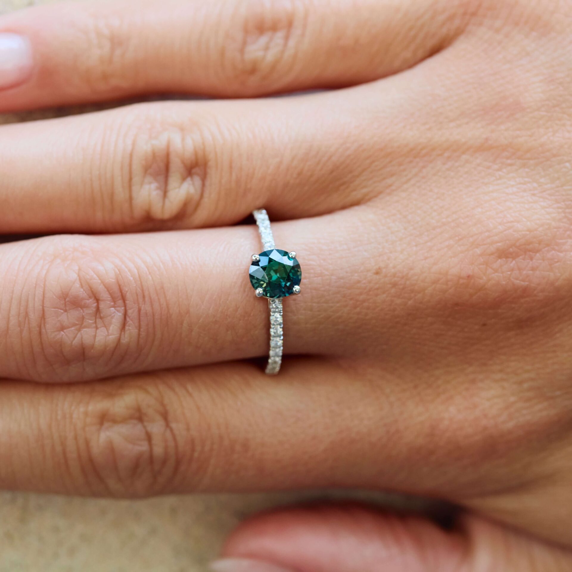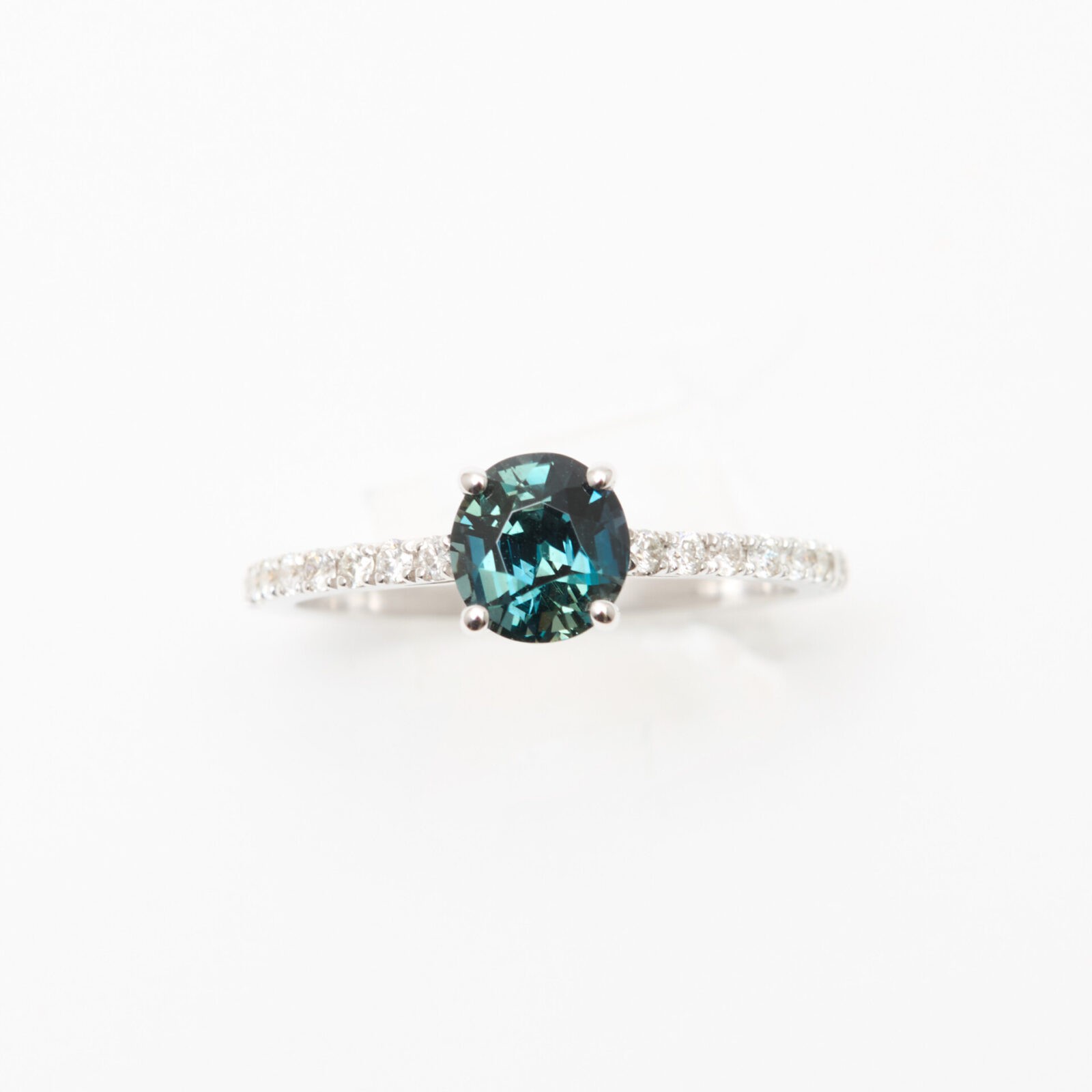 - Bague Trinco en or blanc sertie d’un Saphir Teal de 1.15 carats de forme ovale accompagné de 16 diamants FVS de 1.4mm sur l’anneau (poids total 0.18 carats)