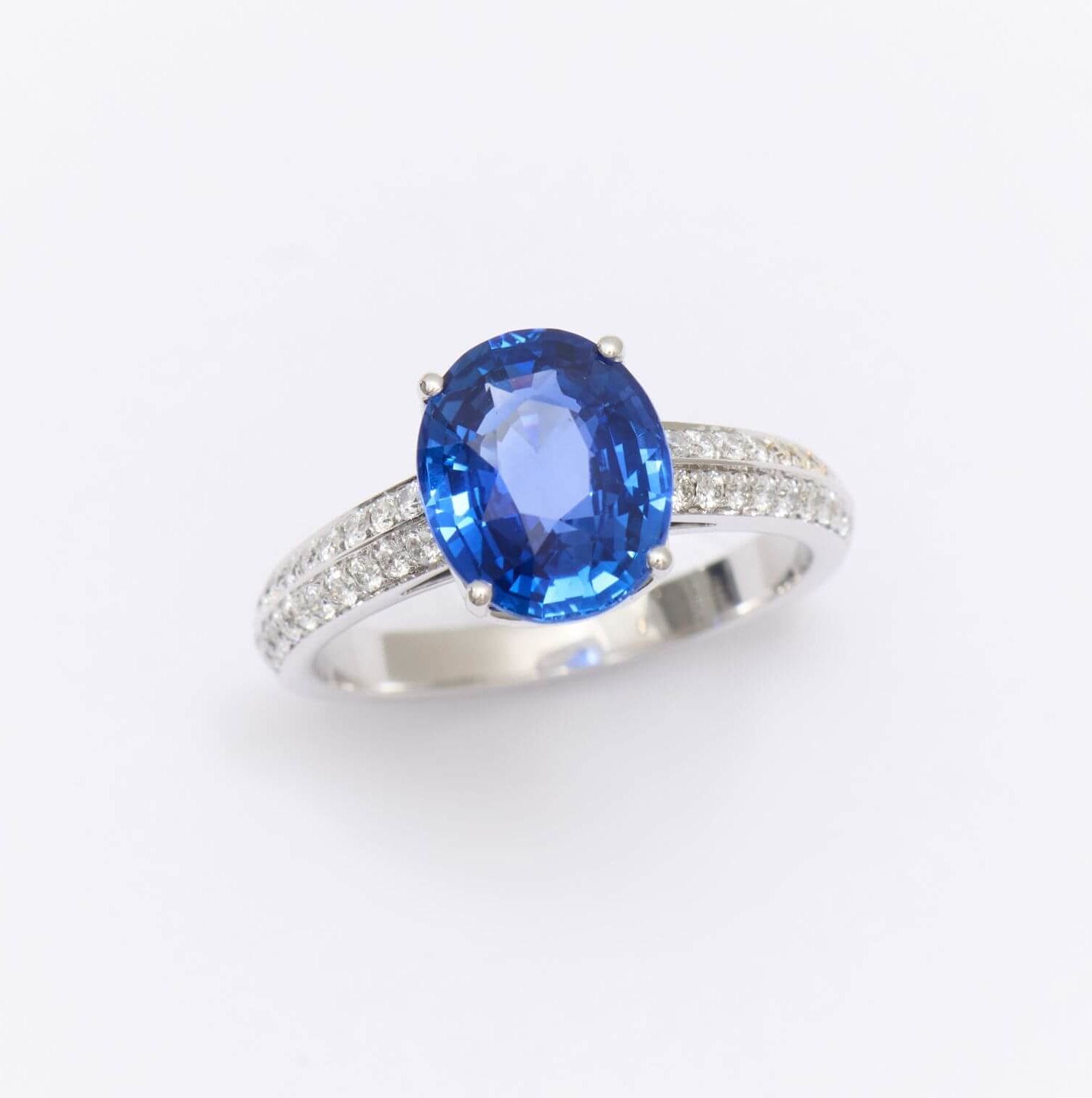 - Bague Trinco en or blanc sertie d’un Saphir Vivid Blue de 3.22 carats de forme ovale accompagnée de diamants FVS sur l’anneau