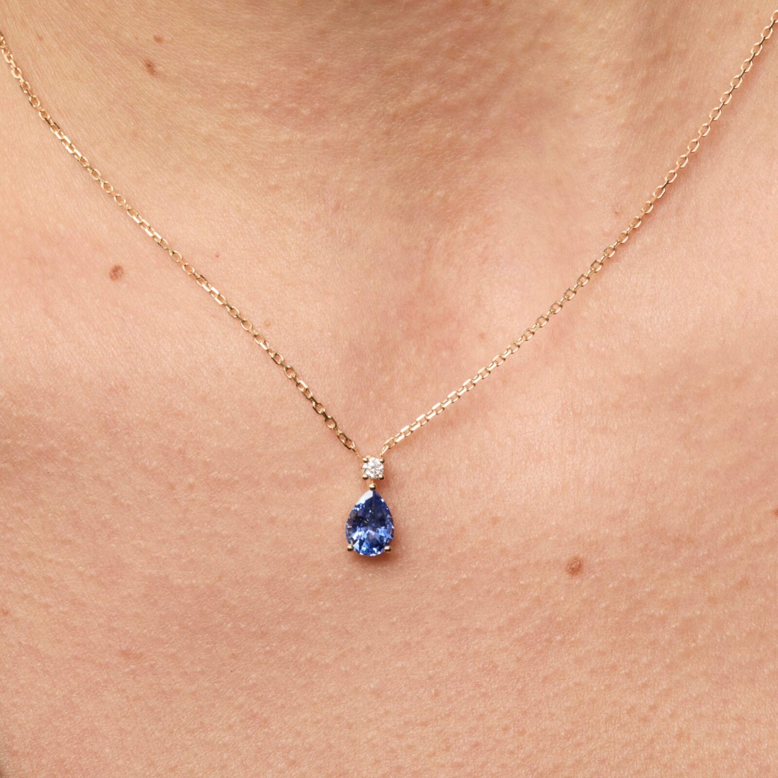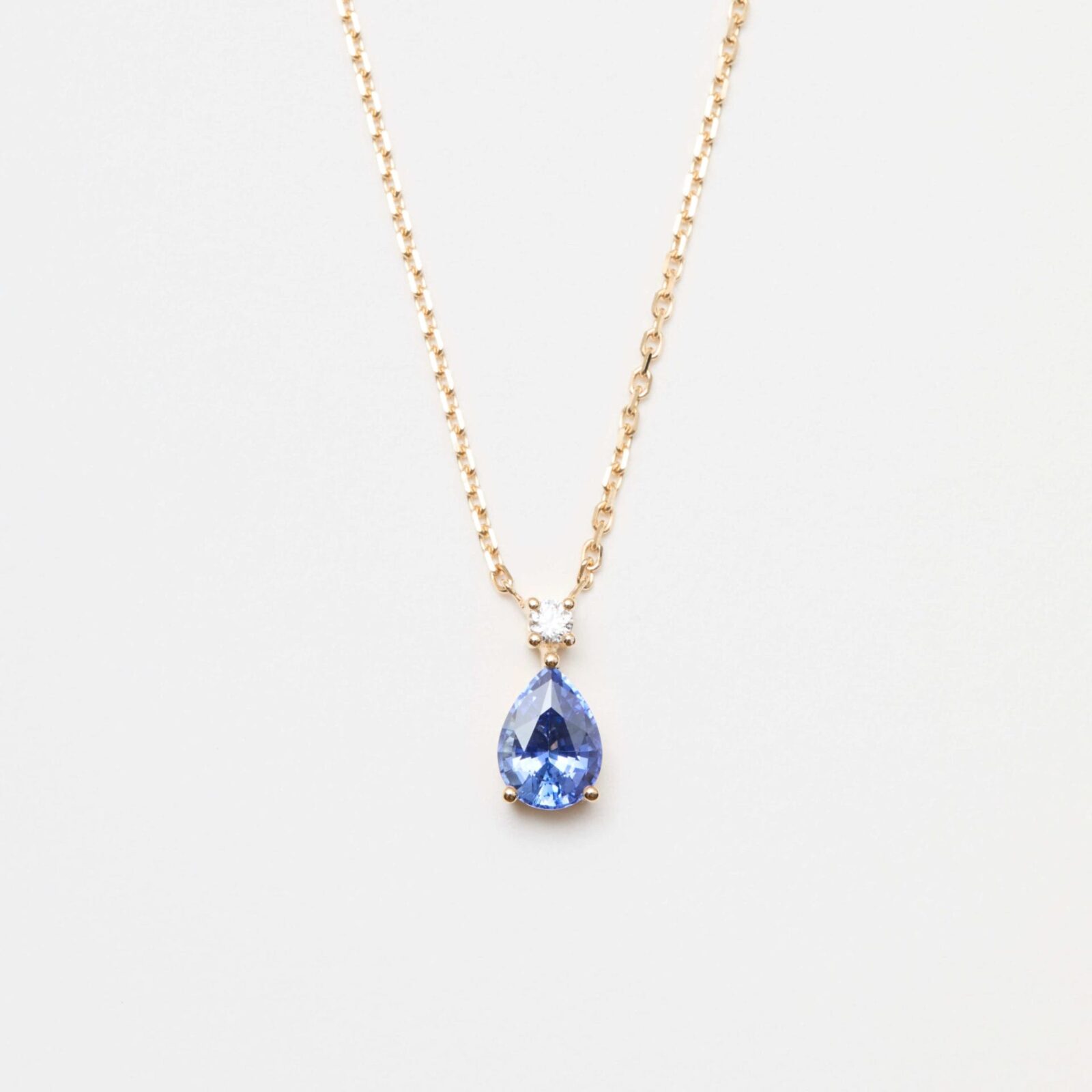 - Collier Ceylan en or jaune sertie d’un Saphir Cornflower de forme poire de 1.18 carats avec un diamants FVS de 2.4mm.