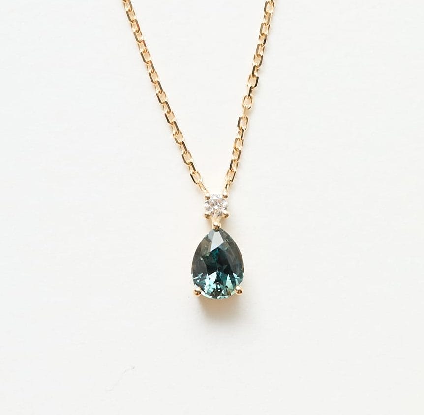 • Collier Ceylan en or jaune sertie d’un saphir Teal de forme poire de 1.20 carats avec un diamants FVS de 2.4mm.