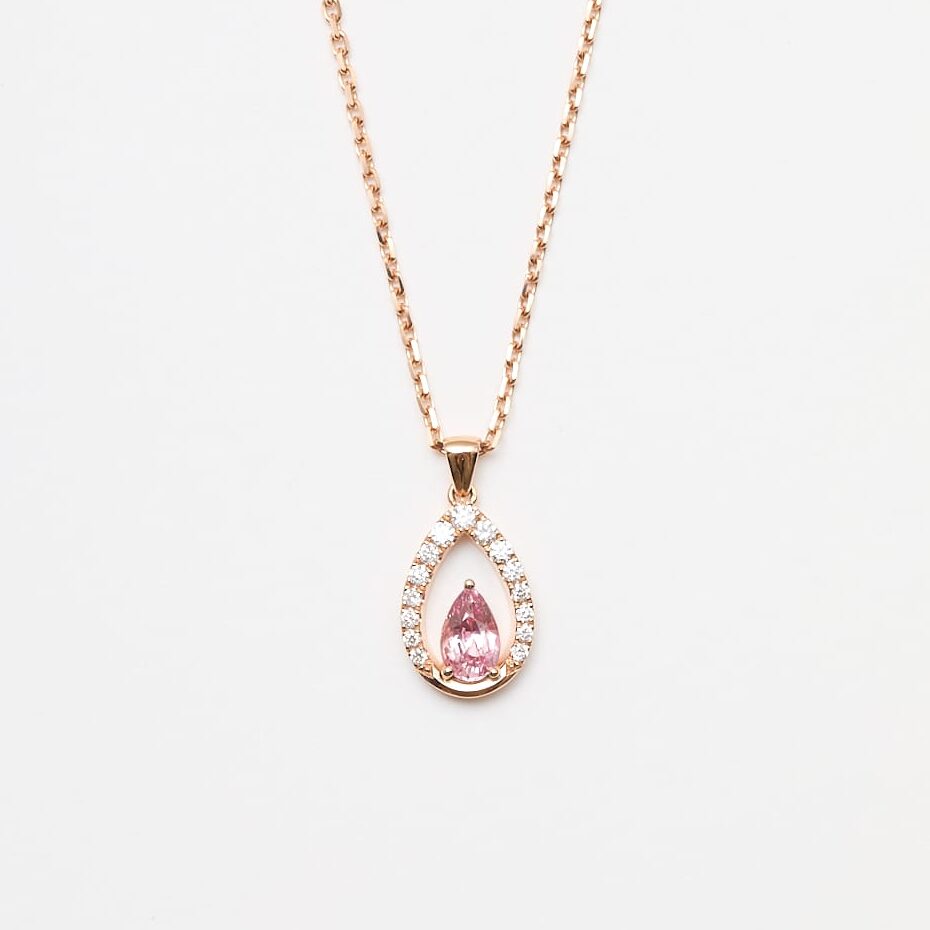 • Collier  en or rose sertie d’un Saphir padparadscha non chauffé de forme poire de 0.60 carats avec d’un entourage de diamants FVS (0.57 carats).