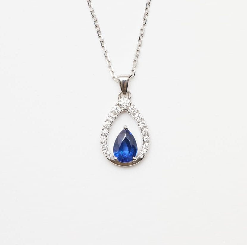 • Collier Devi en or blanc sertie d’un Saphir Peacock de forme poire de 1.00 carats avec un entourage de diamants FVS (poids total 0.56 carats)