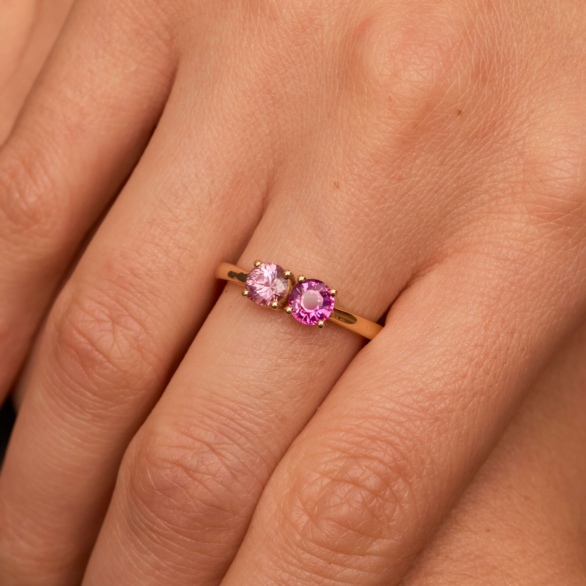 - Bague Toi et Moi en or rose 18 carats sertie d’un Saphir Rose Pastel 0.53 carats et d’un Saphir Rose Intense 0.44 carats.