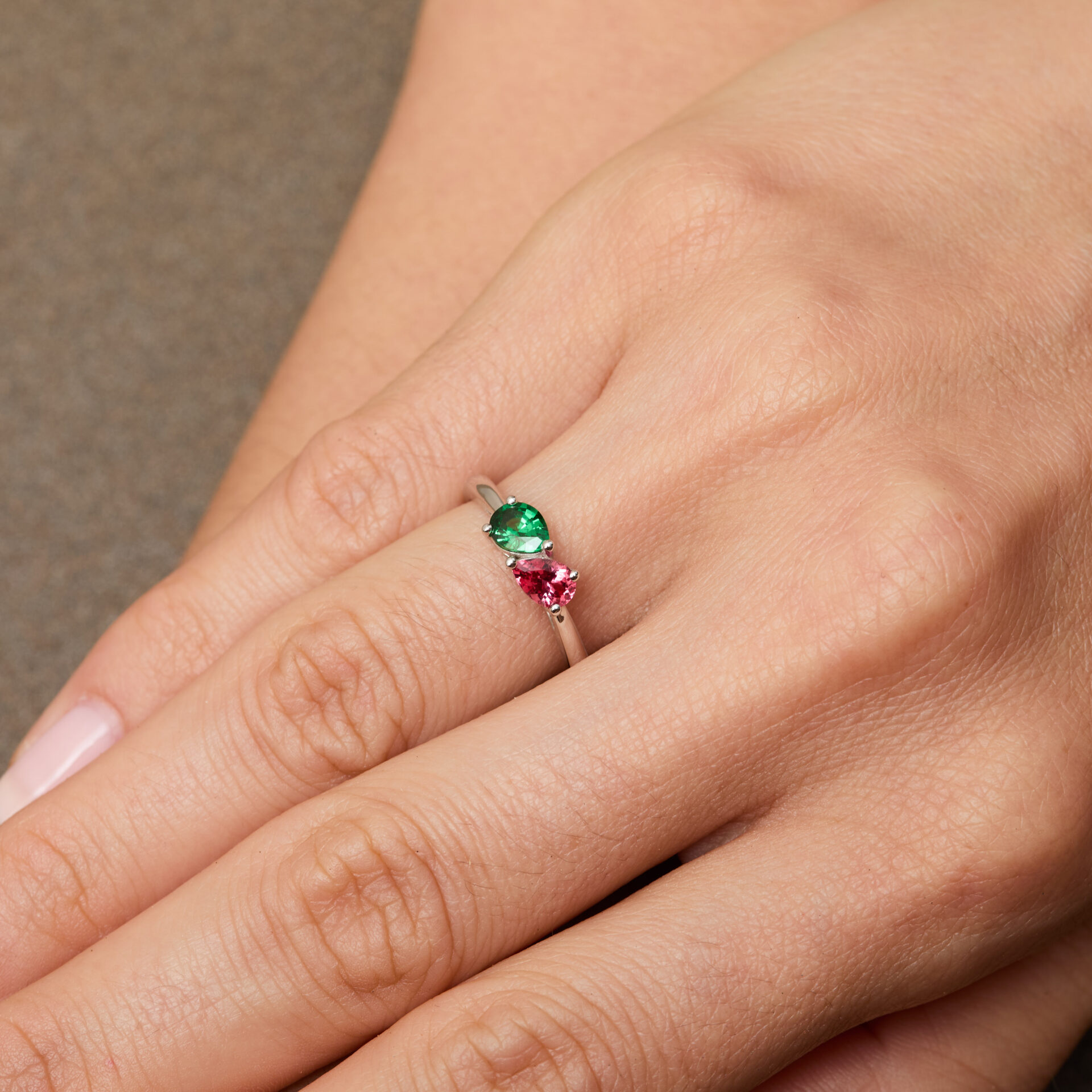 - Bague Toi et Moi en or blanc 18 carats sertie d’une Tsavorite 0.45 carats et d’un spinelle mahenge 0.40 carats.